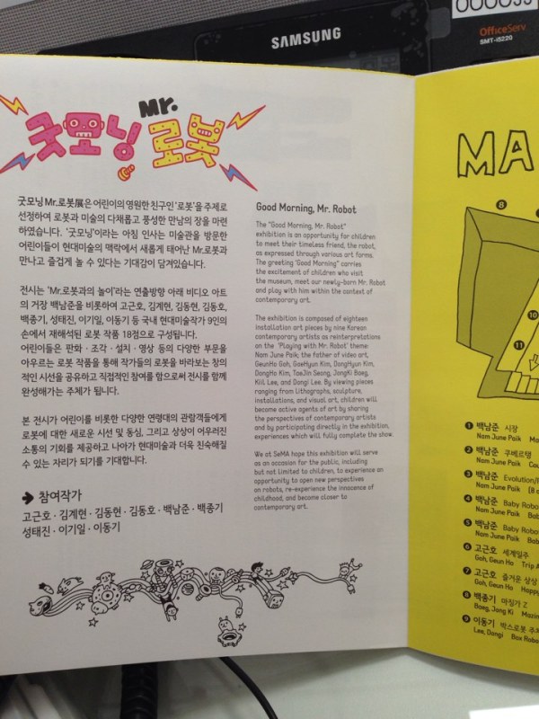 This was three years after I worked for Yann Arthus-Bertrand’s solo exhibition “Home” (Link to post) at SeMA, and a friend of mine had either started or finished working there as an intern or as an interpreter (my age is catching up with me; I can’t recall the details). I got an email (or more likely, a Kakaotalk message) from one of the curators at SeMA (which is funded and operated by Seoul City, not to be confused with the MMCA’s Seoul wing), asking if I would translate a pamphlet for the upcoming “Good Morning, Mr. Robot” exhibition.